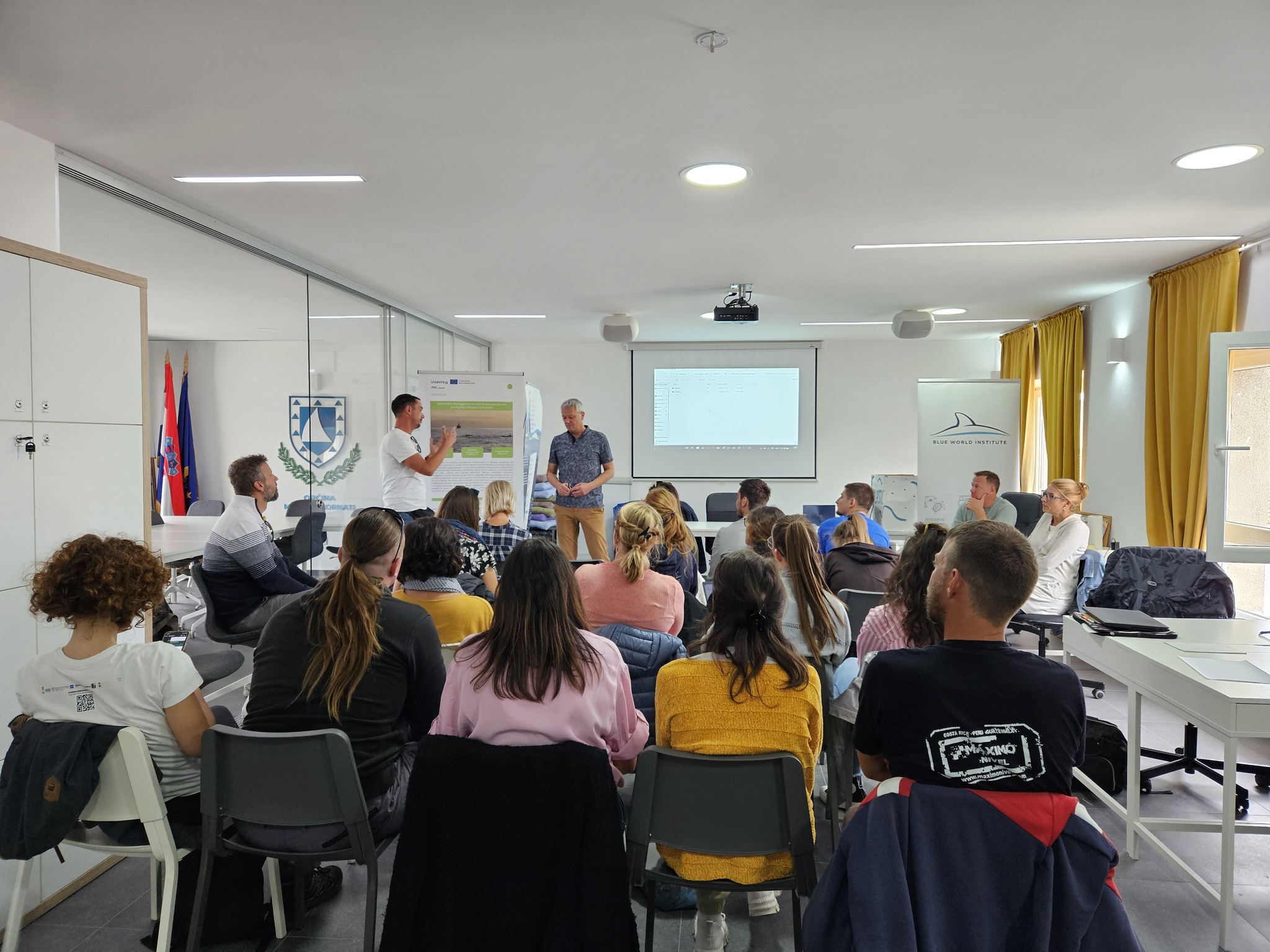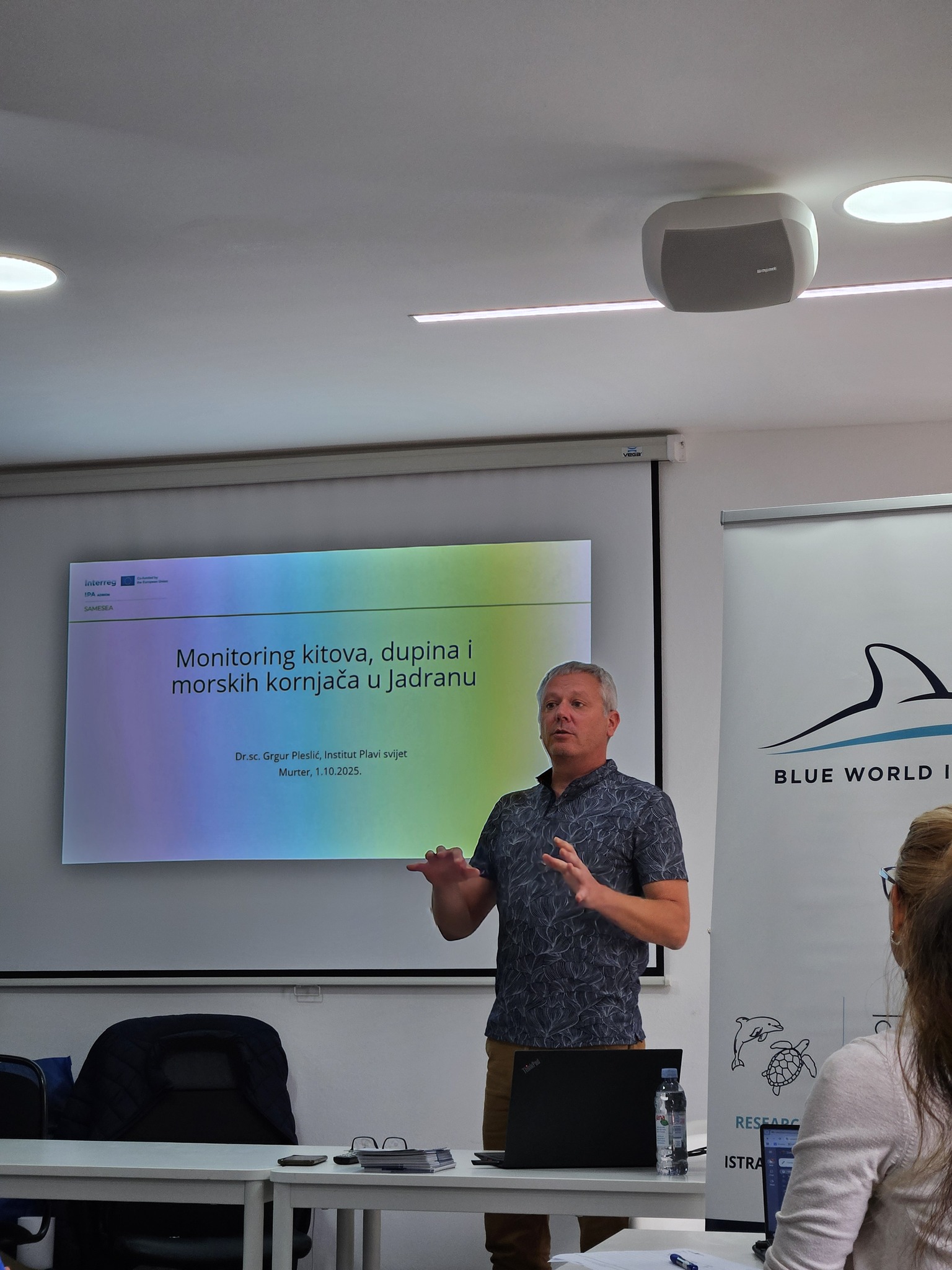 Od 30. rujna do 2. listopada 2025. u Murteru se održala trodnevna radionica “Praćenje dupina, morskih kornjača i sredozemne medvjedice u Jadranu” u organizaciji Instituta Plavi svijet, uz podršku partnera na projektu SAMSEA, koji financira Europska unija kroz Interreg IPA ADRION program. Prvi dan bio je rezerviran za demonstraciju metoda praćenja na moru – sudionici su se brodom uputili prema ribogojilištu kod Vrgade gdje su mogli vidjeti kako izgleda terenski rad u stvarnim uvjetima. Drugi i treći dan radionice donijeli su zanimljiva predavanja i rasprave o monitoringu morskih sisavaca i kornjača, ulozi građana i ribara u očuvanju mora te demonstraciju postupaka u slučaju pronalaska ozlijeđenih životinja. Cilj radionice bio je razmjena znanja i iskustava između stručnjaka, istraživača i predstavnika organizacija iz svih jadranskih zemalja – za održivo upravljanje i zaštitu naših morskih sentinel vrsta.